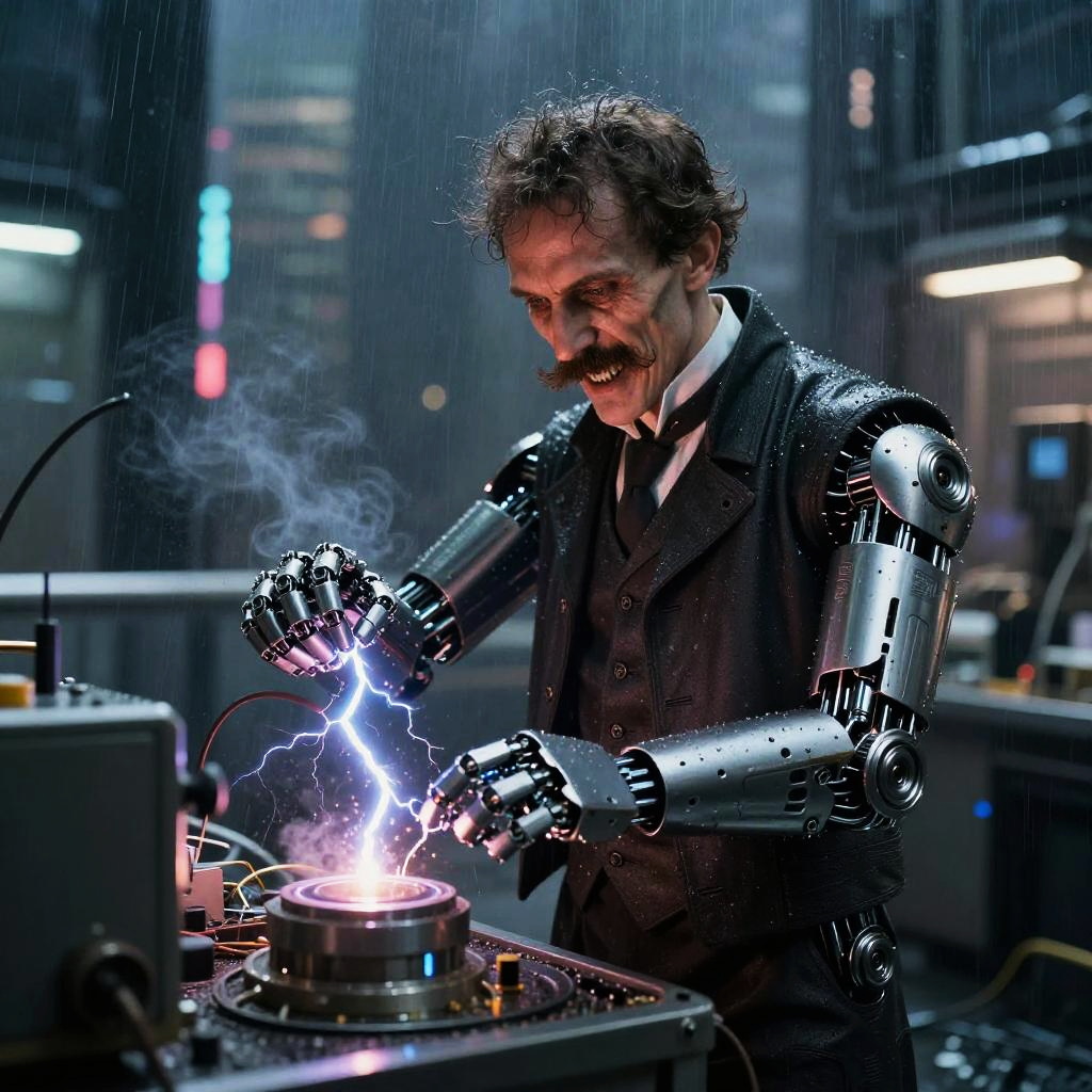 Cinematic film still (( portrait of Cyberpunk Nicola Tesla with an robotic arm)) in his Lab he execute an experiment, laboratory equipment, lightning, dust, smoke, evil laughing, cyberpunk, in heavy raining futuristic tokyo rooftop cyberpunk night, sci-fi, fantasy, intricate, very very beautiful, elegant, neon light, highly detailed, digital painting, artstation, concept art, soft light, hdri, smooth, sharp focus, illustration, . shallow depth of field, vignette, high budget, bokeh, cinemascope, moody, epic, gorgeous, film grain, grainy