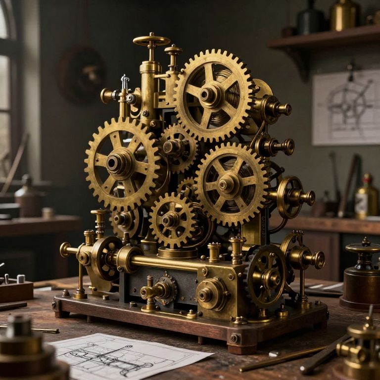 Photorealistic CGI of intricate, golden mechanical gears and pistons on a wooden workbench in a dimly lit workshop.