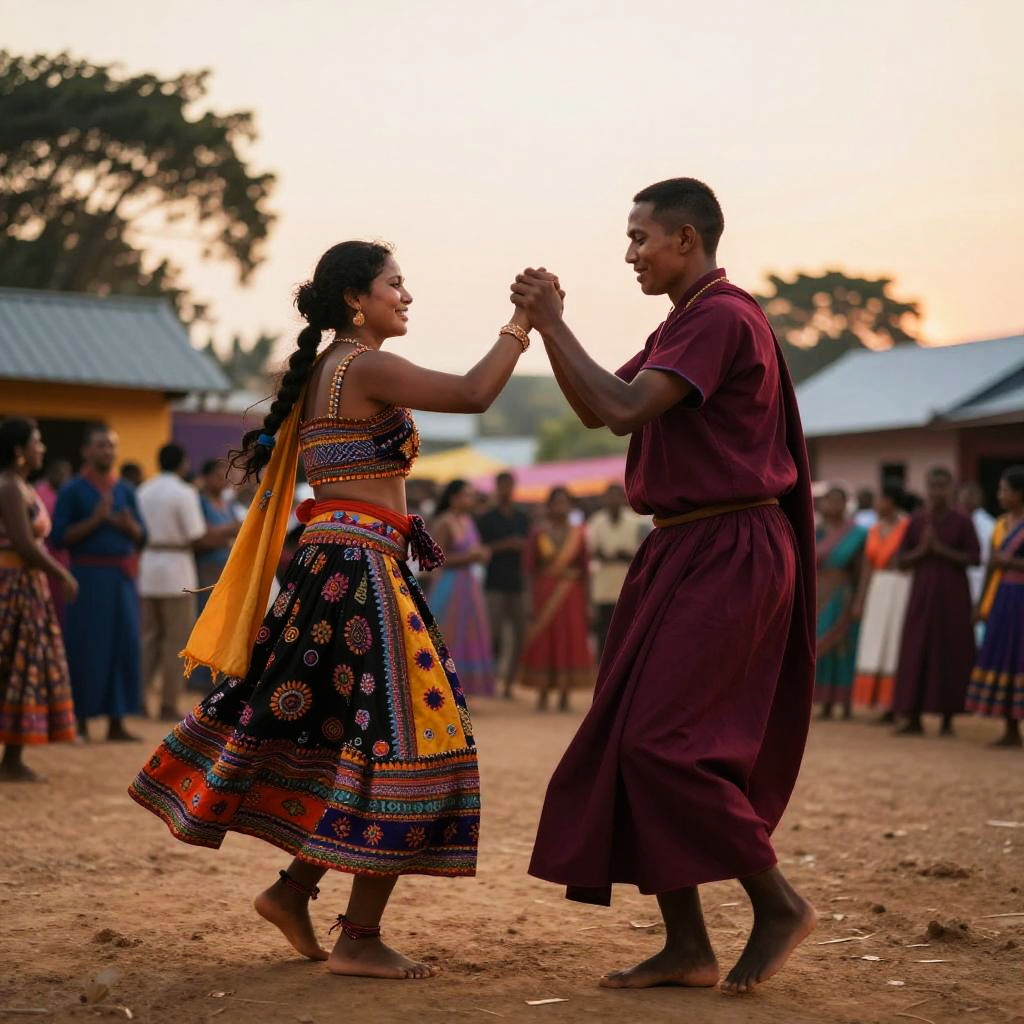 Priest dancing with woman in a vibrant village festival, colorful traditional clothes, joyful expressions, lively background, warm sunset lighting, dynamic motion captured vividly