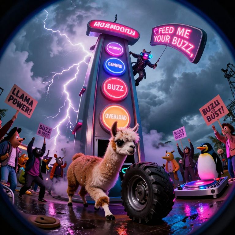 Captured with a cinema-grade 12mm fisheye lens, the surreal scene unfolds around the towering “BUZZ MONOLITH”, curving into the clouds, Its neon buttons—“GIMME, ” “BUZZ, ” and “OVERLOAD”—bulge outward, glowing intensely as crackling lightning arcs illuminate the moody dusk sky, The lens’s distortion emphasizes the machine’s absurd, larger-than-life scale, At its base, a llama with sweat-matted fur struggles to push a tractor-tire-sized coin toward the oversized slot, Its determined expression, bulging eyes, and trembling legs are captured in vivid detail, Around it, a chaotic crowd of humans and anthropomorphic animals cheer wildly, their signs—“LLAMA POWER!” and “BUZZ OR BUST!”—warping with the lens’s curvature, Nearby, a penguin DJ spins on a metallic turntable, neon lights reflecting off its glossy surface, Above, a sly tabby cat in a cyberpunk trench coat and glowing VR goggles scales the monolith, a grappling hook in tow, Its neon-lit goggles glow sharply as it approaches the flickering sign “FEED ME YOUR BUZZ, ” warped into an ominous curve by the lens, The fisheye’s distortion adds drama, exaggerating the scale of the machine and the chaos of the crowd, From the rain-slicked ground to the vibrant neon reflections, every detail pops in this cinematic snapshot of determination and mischief