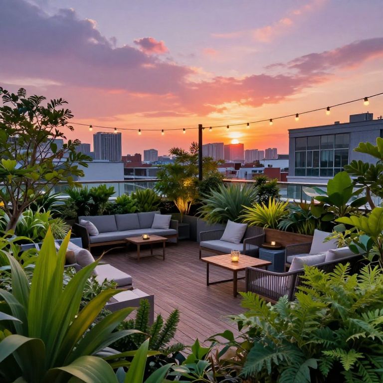 Urban Rooftop Garden at Sunset