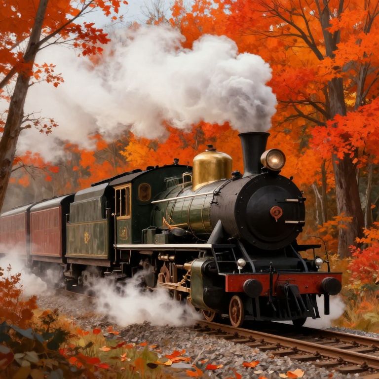 Titled vintage steam train chugging through autumn forest, with vibrant orange and red foliage, steam clouds billowing, nostalgic, painterly style with rich textures and warm colors, evoking a sense of adventure and history.