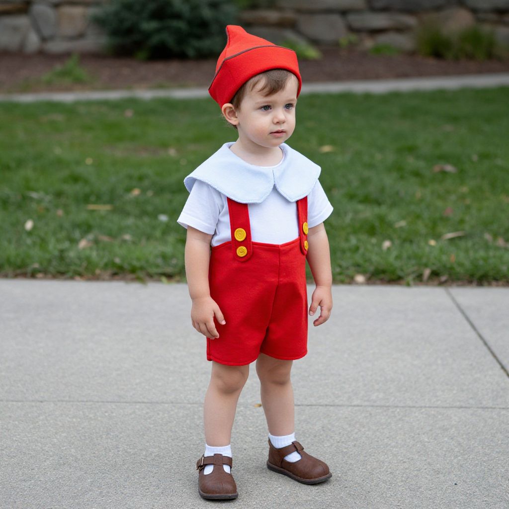 Kid Pinocchio Costume, toddler dressed in a red outfit and hat standing on a sidewalk