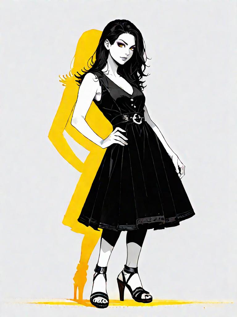 1girl, source_comics, realistic face, full body shot, Woman, chic, fitted knee-length dress with a tweed-like texture, scoop neckline with embellished trim, sleeveless, charcoal and white blended color, straight silhouette, black high-heeled sandals with ankle strap, vibrant yellow clutch.