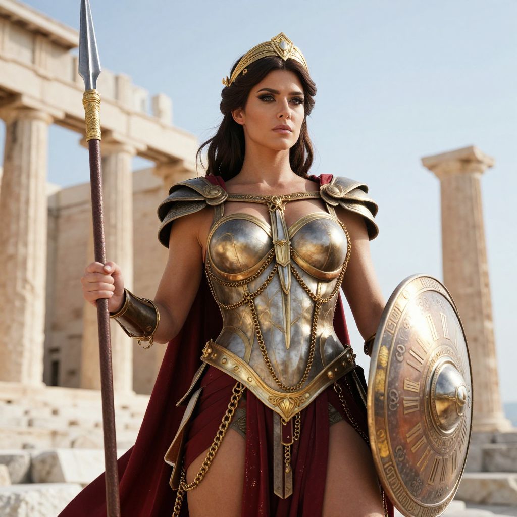 A realistic photorealistic image of a woman in a detailed Athena warrior goddess costume, wearing majestic armor forged with golden chains and intricate designs, symbolizing wisdom and power, standing on a sunlit ancient Greek acropolis with marble columns and a clear sky, her face strong and noble with piercing intelligent eyes, sharp cheekbones, and a calm authoritative expression, holding a shield inscribed with ancient Greek symbols and a spear radiating light, wearing a flowing red and silver warrior robe over the armor, glowing with subtle radiant energy. The woman has big tits and cute face