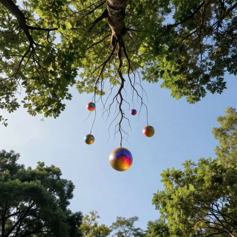 Photograph of a bright, clear blue sky seen through the canopy of tall, green-leaved trees. Several colorful, spherical ornaments in shades of red, orange, yellow, and blue hang from thin, leafless branches, creating a whimsical, floating effect. The sunlight filters through the leaves, casting dappled shadows. The trees in the background vary in size and density, with some branches extending outwards, framing the colorful orbs. The overall composition evokes a sense of serenity and playful artistry in a natural setting.