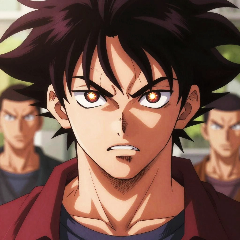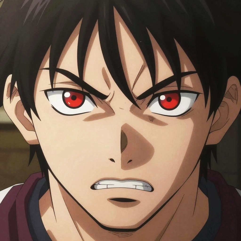 Glare anime angry face close-up, intense eyes with sharp pupils glowing red, furrowed brows and clenched teeth, dynamic lighting highlighting fierce expression, detailed anime art style with vibrant colors and dramatic shadows.