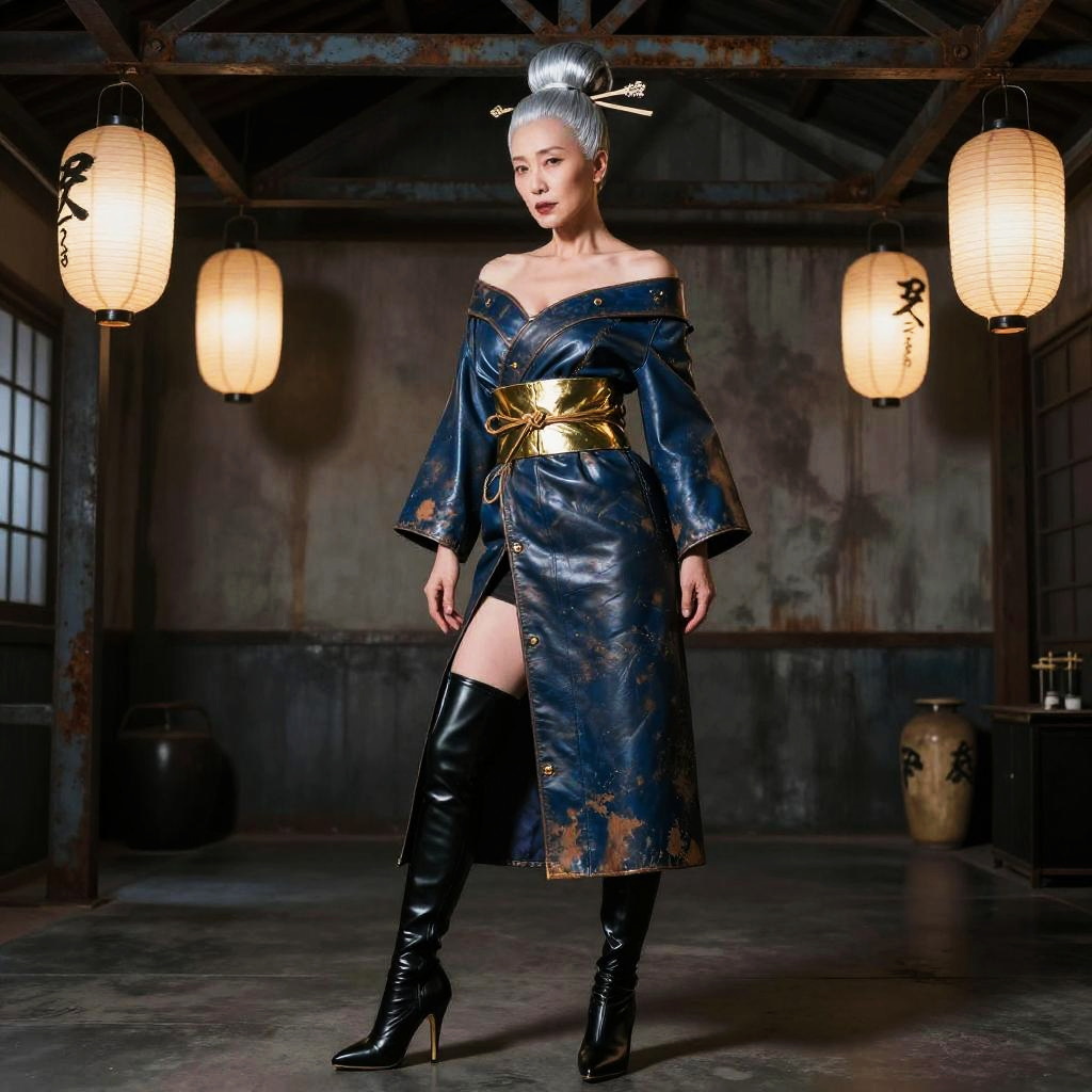 Image in the style of Post-Industrial Baroque Photorealism, retired samurai courtesan, silver topknot with shaved temples and ornamental kanzashi, compact martial elegance, (Leather & Latex Off-Shoulder Dress:1.3), weathered indigo leather off-shoulder kimono-dress with lacquered brass obi, matte-ink thigh-high latex boots, lacquered geta-heel accents, smoky industrial dojang studio with hanging paper lanterns and rusted steel beams studio background