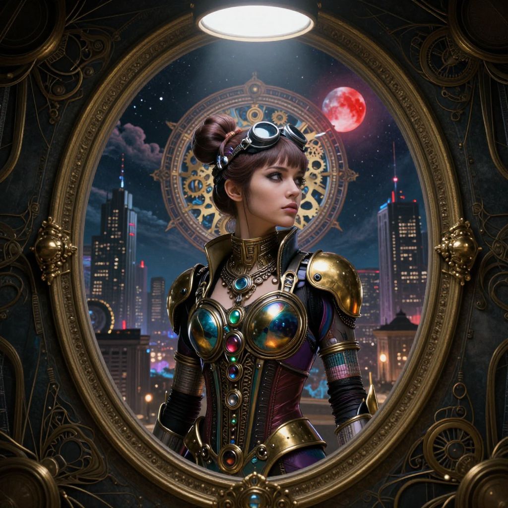 Steampunk cyberpunk female warrior with intricate armor, goggles, and colorful gemstones, framed by ornate mirror, against a futuristic cityscape.