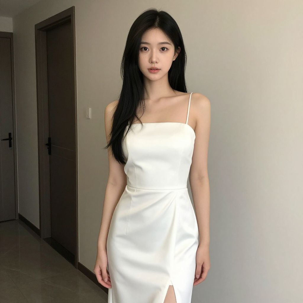Photograph of an East Asian woman with long, straight black hair standing in a minimalist room. She wears a fitted, strapless white satin dress that accentuates her slender figure and small breasts. The dress has a subtle cutout at the waist. Her skin tone is light, and she has a neutral expression with subtle makeup. The background features a plain white wall, a closed wooden door on the left, and a smooth, dark gray floor. The image has a slightly over-exposed, digital effect, giving it a slight glow.