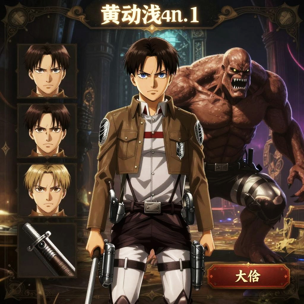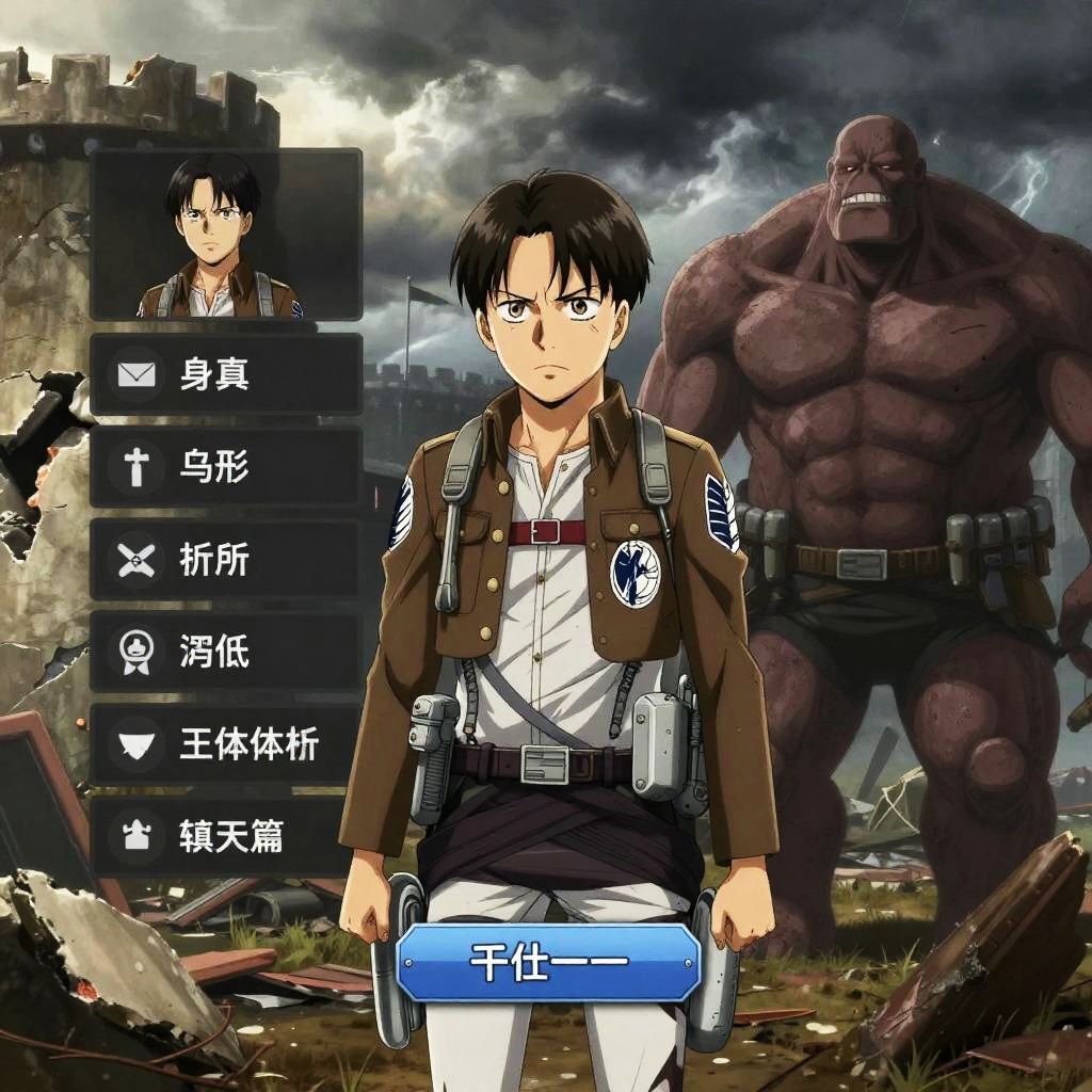 Create an imagined Attack on Titan character maker screen with options to design soldiers and Titan forms, featuring anime-style characters with detailed expressions, military uniforms, vertical maneuvering equipment, against a backdrop of crumbling walls under a stormy sky.