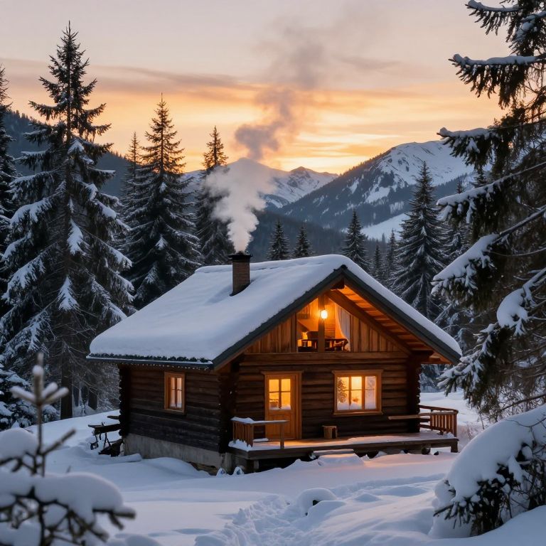 Winterbilder showcasing a cozy cabin nestled in a snowy mountain valley, smoke curling from the chimney, surrounded by snow-dusted pine trees under a golden sunset sky, warm interior light glowing through frosted windows, highly detailed and atmospheric.