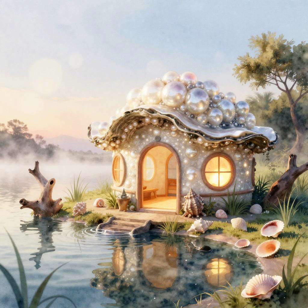 Whimsical watercolor of a fairy-tale mushroom house with glowing windows, nestled in a magical forest under a starry night sky.