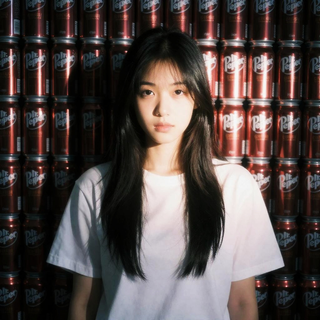 Highres, masterpiece, perfect lighting, bloom, cinematic lighting, detailed face, sks person wearing plain white t-shirt, long hair, surrounded by soda cans, mountain of soda cans, dr. pepper
