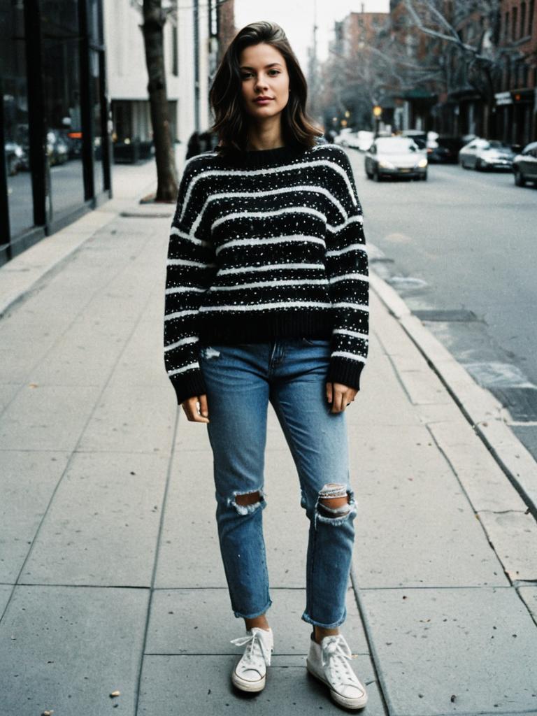 Mock Neck Pullover Sweater Woman, woman in a white sweater and jeans standing on a brick street