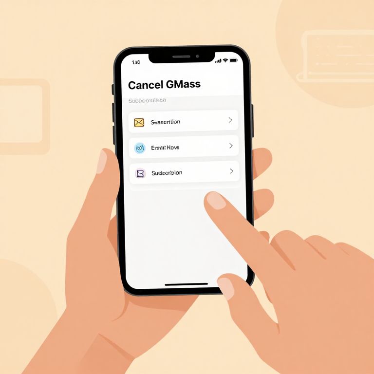 Illustration of how to cancel GMass subscription, hands navigating email settings on smartphone, clear notifications, user-friendly app design, warm lighting, minimalistic background with subtle tech elements.