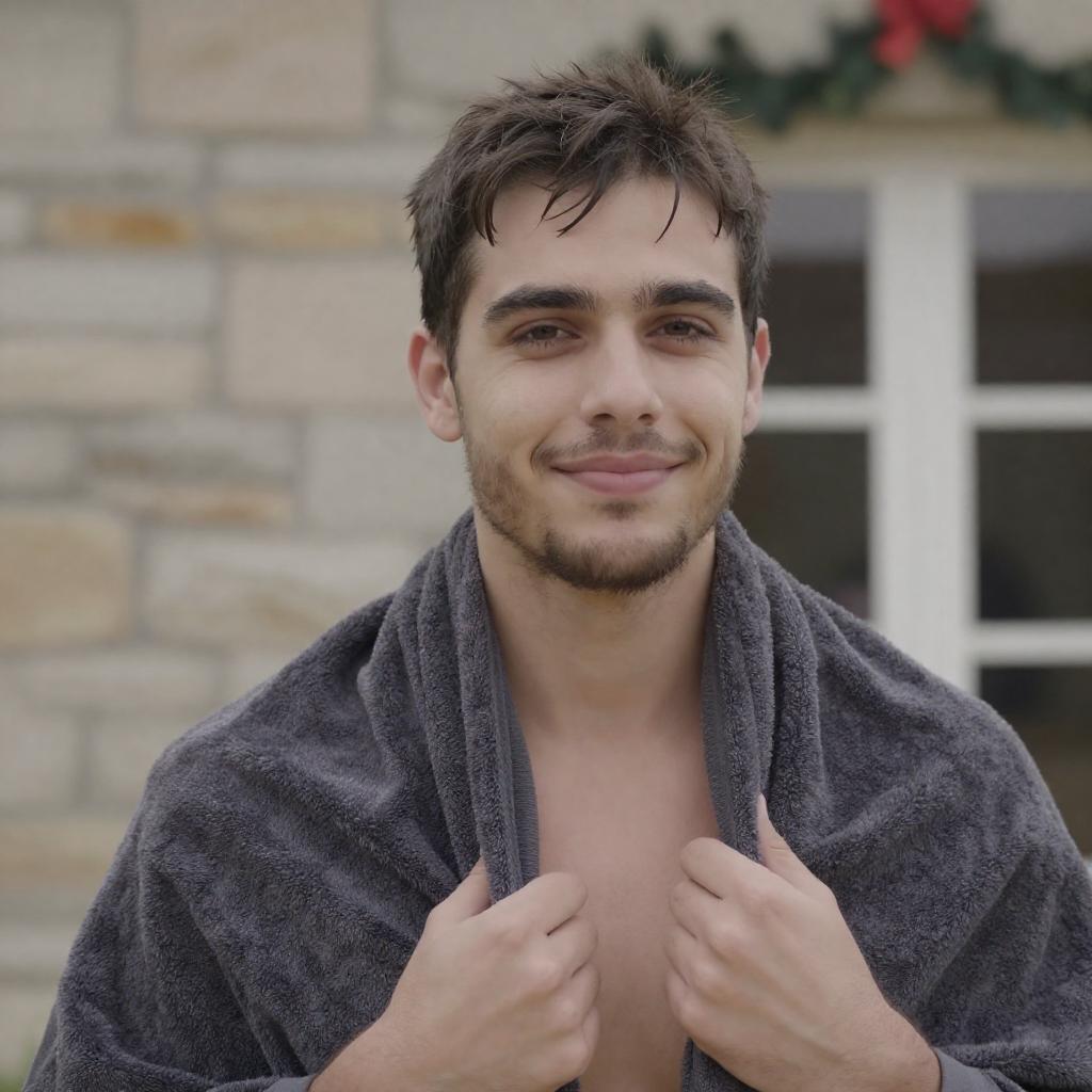Photograph of a young man with fair skin and short, dark brown hair, slightly wet, wearing a dark gray towel draped over his shoulders. He has a light smile and a slight beard. Background includes blurred stone wall, holiday garland, and white window. Man is centered, looking slightly to the right.