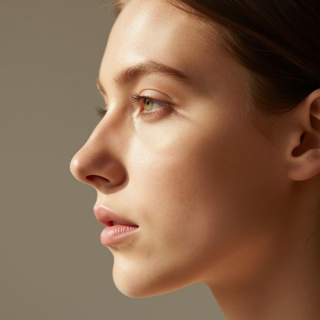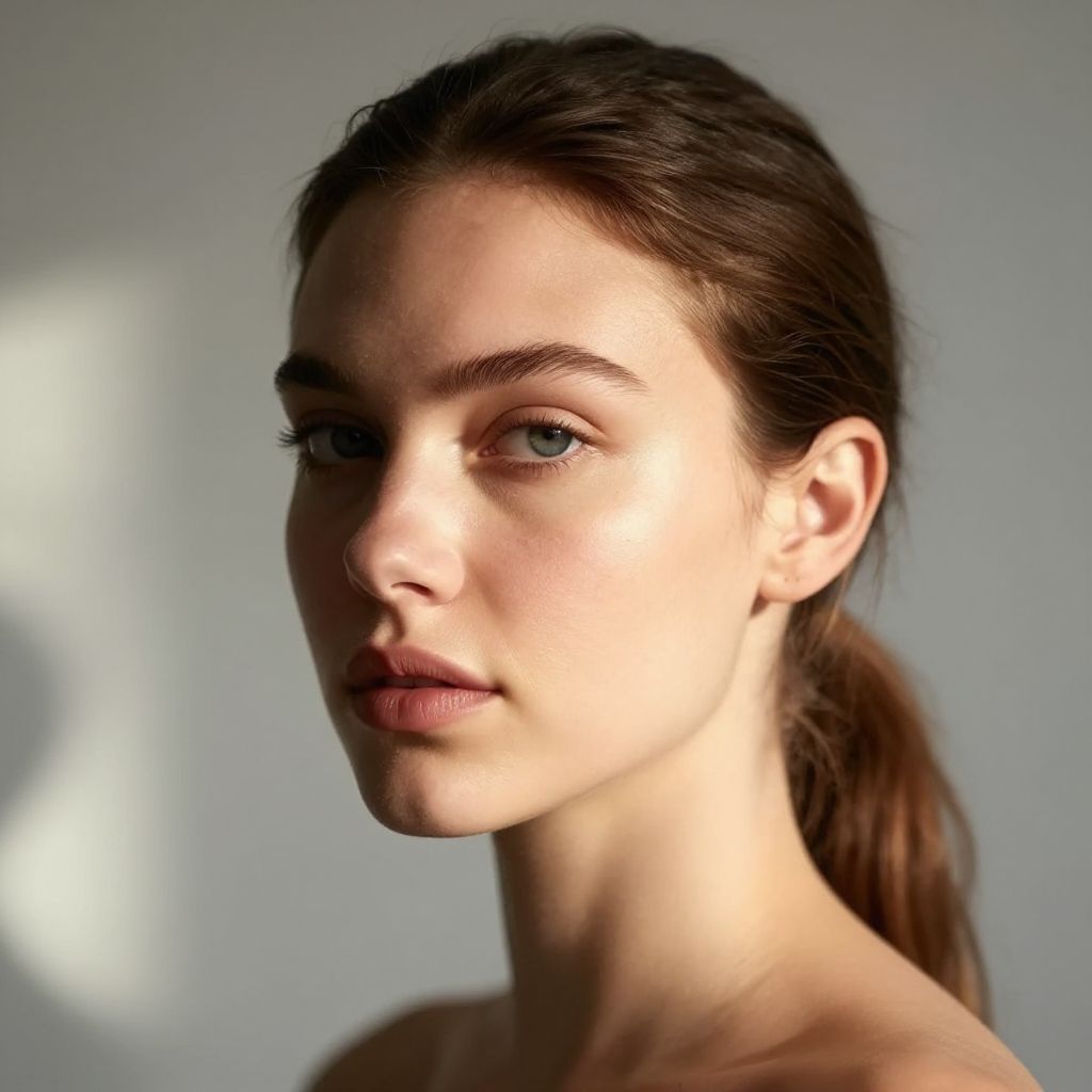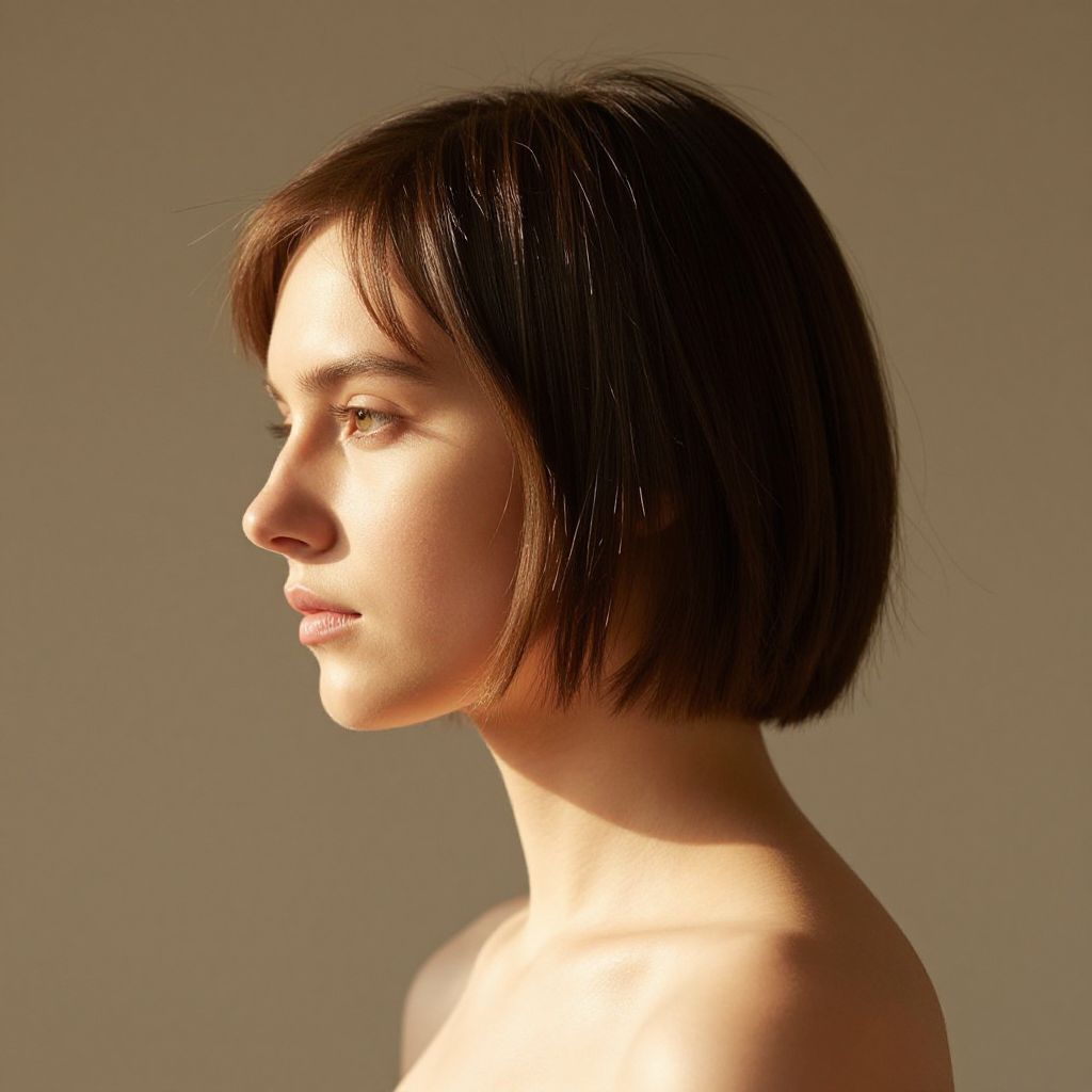 What will i look like with brown hair, elegant side profile of a woman with silky light brown hair tied in a loose bun, minimalist studio background, delicate freckles on skin, soft shadows and highlights, fine art photographic realism, calm and introspective mood