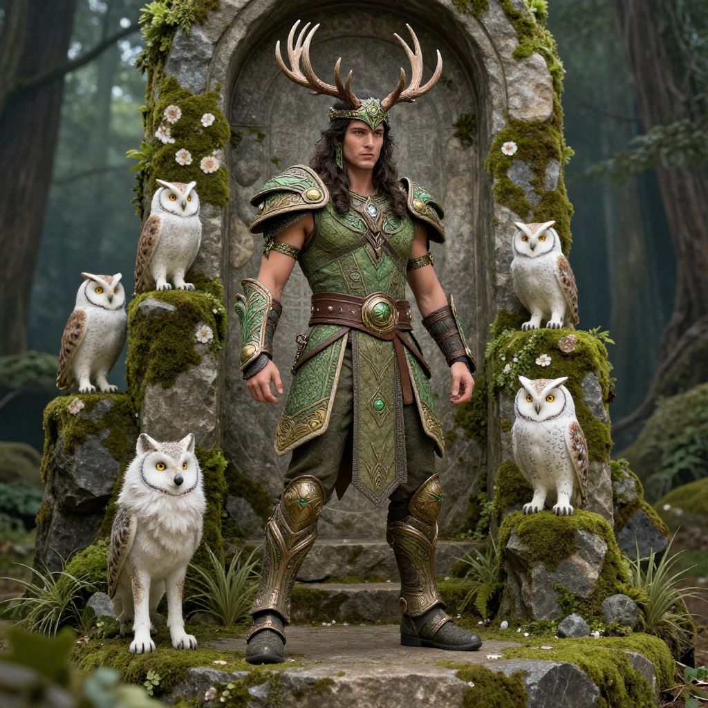 A digital CGI image of a muscular man with long brown hair, wearing intricate green and gold armor with antlers, standing in a moss-covered, ancient stone archway in a forest. He is flanked by four white owls perched on mossy stone ledges. The background features tall, dark green trees. The man's armor is detailed with patterns, and he has a serious expression. The image has a fantasy, mythical style, with rich textures and vibrant colors.