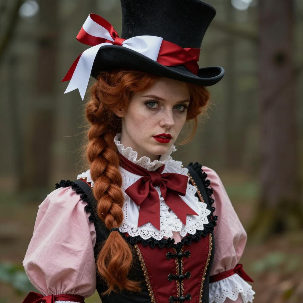Magician woman costume, photorealistic portrait of a blonde woman, Victorian steampunk outfit, black top hat with silver emblem, wavy hair, blue eyes, white ruffled shirt, black double-breasted jacket with gold buttons, black ribbon tie, white lace cuffs, dark background, serious expression, digital art, high detail, realistic ures, symmetrical composition, front view, slight soft focus on background