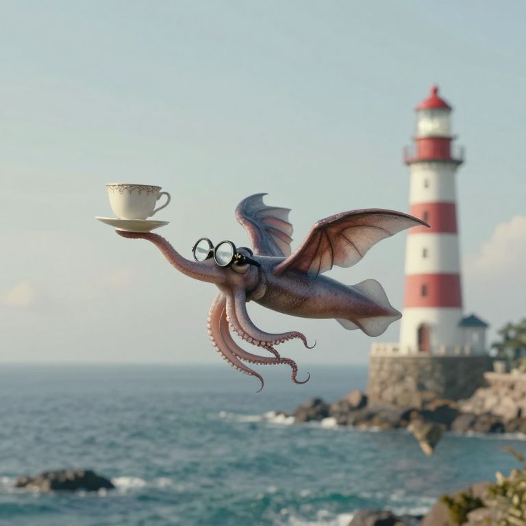 A whimsical squid adorned with wings and a monocle gracefully flies backward, balancing a teacup on its tentacle as it circles a floating lighthouse that defies gravity against a serene coastal backdrop.