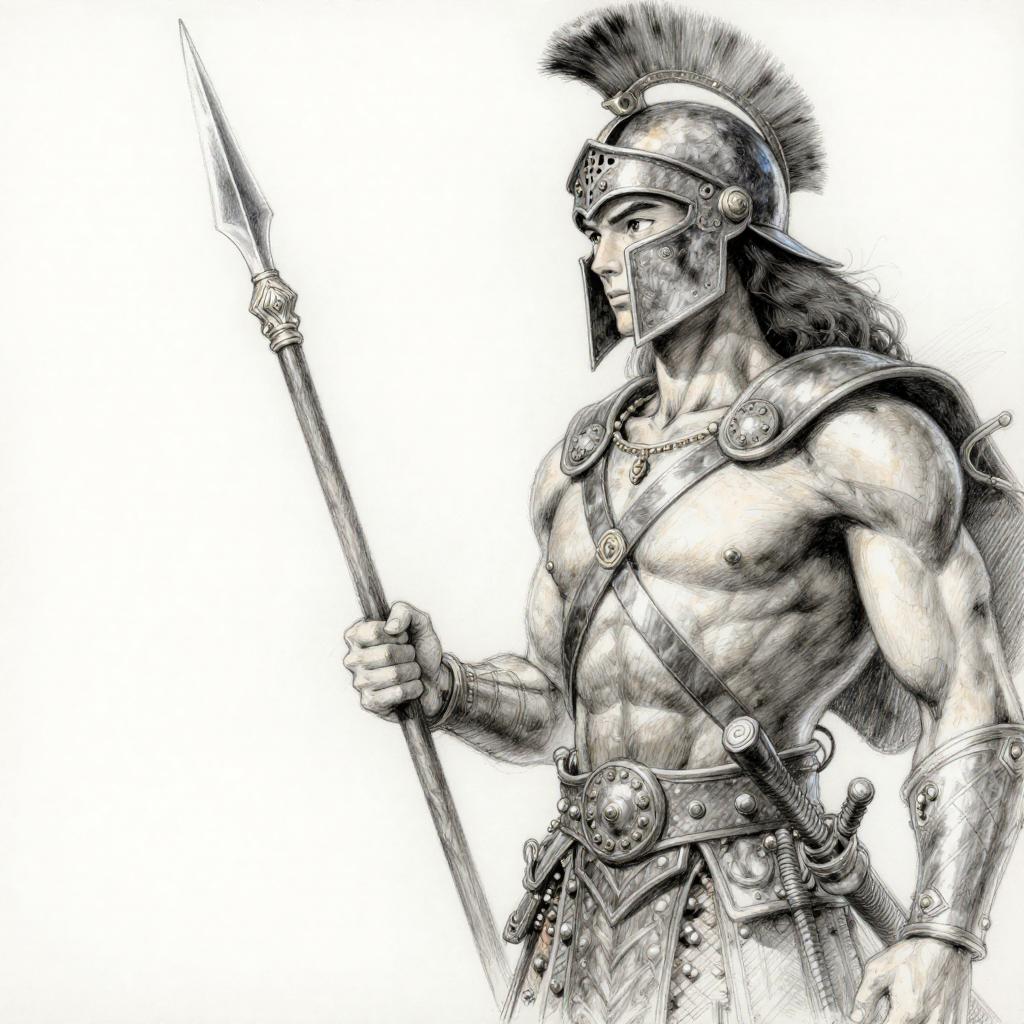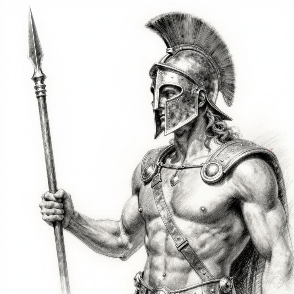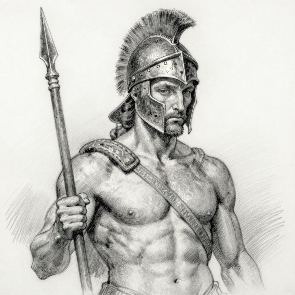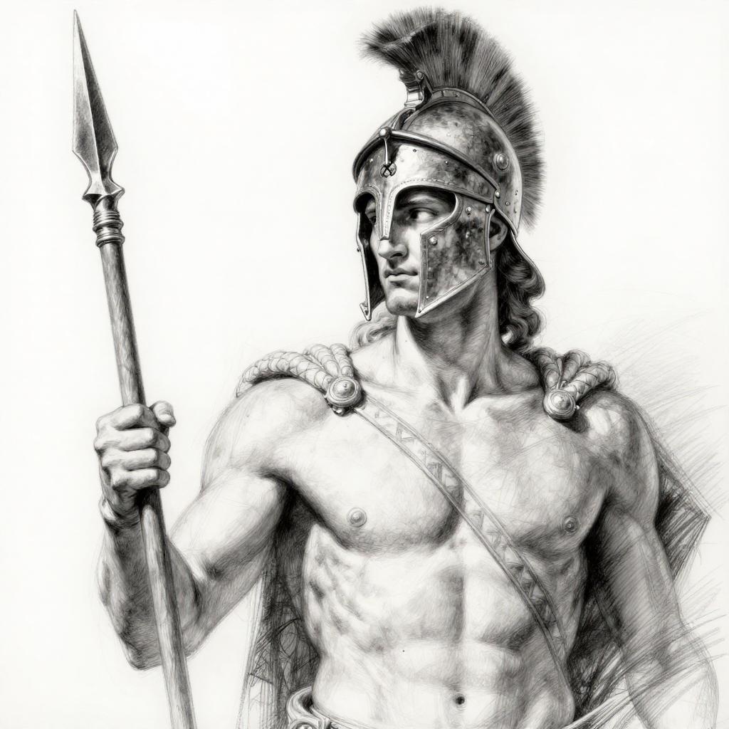 Highly detailed painting of achilles holding a spear and wearing a helmet, a pencil sketch by Eugène Delacroix, trending on artstation, mythology, loose pencil sketch, sketchy, concept art, cinematic, white space