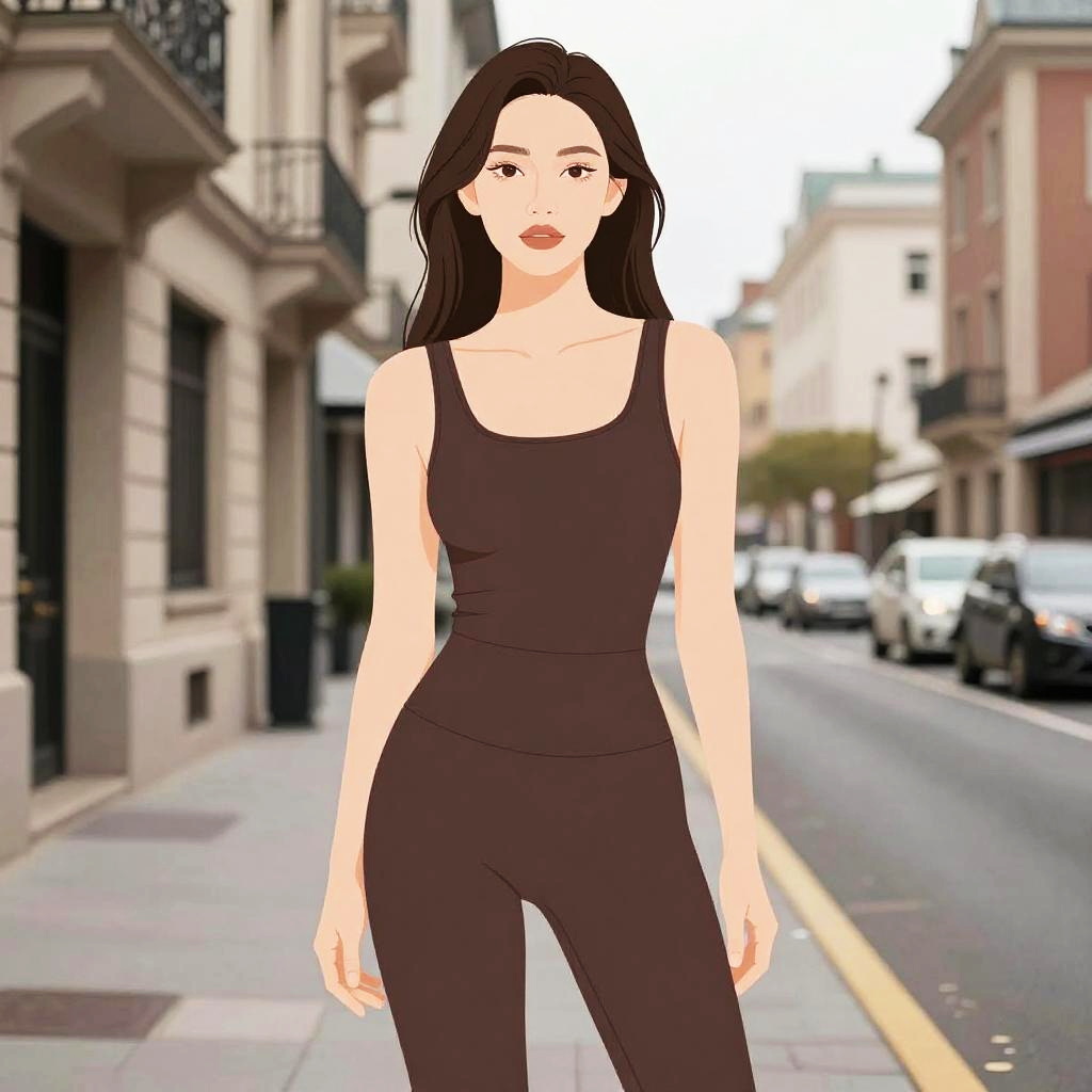 Minimalist illustration of a woman with long straight hair wearing a chocolate brown fitted tank top bodysuit with a square neckline and thin straps. The form-fitting bodysuit seamlessly transitions into legging-like bottoms. She has neutral-tone makeup and stands on a city street with classic architecture and parked cars in the background.