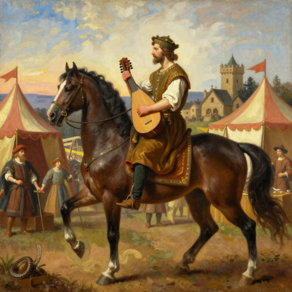A valiant knight clad in ornate renaissance-style silver armor riding a dark brown horse with a flowing mane. The scene is set against rolling green hills with a majestic castle in the background, illuminated by warm golden hour sunset light. The knight's detailed armor and traditional saddle are prominently featured.