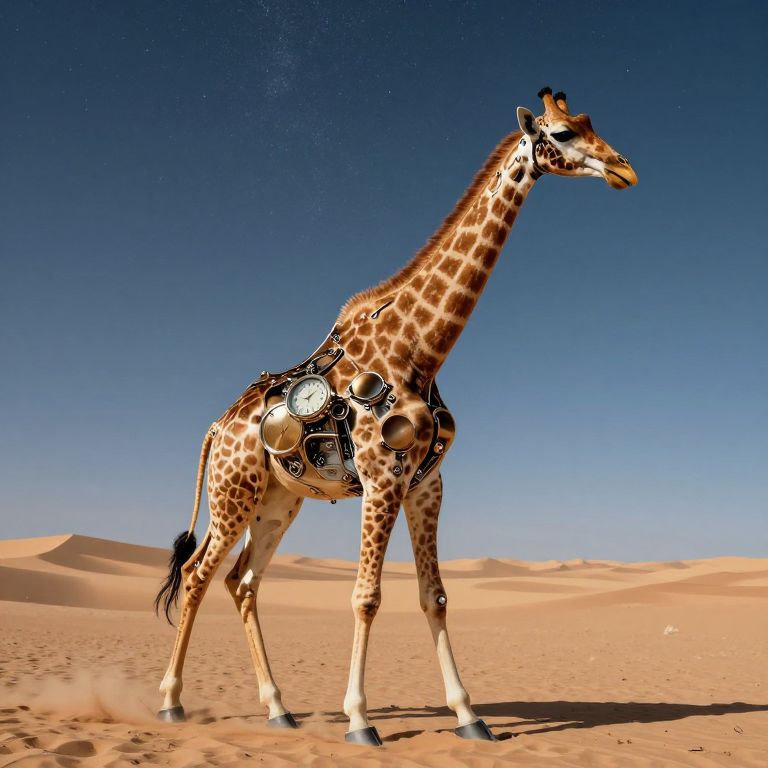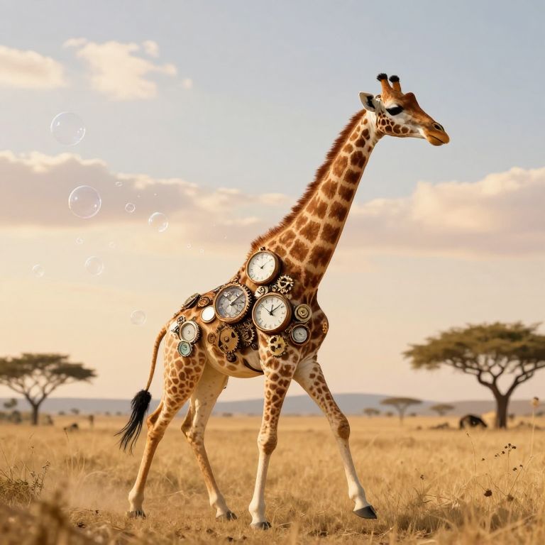 A whimsical giraffe adorned with an array of mechanical clocks and cogs strides gracefully through a sunlit savanna, leaving behind a trail of ethereal bubbles that float serenely against a dreamy, honey-hued sky.