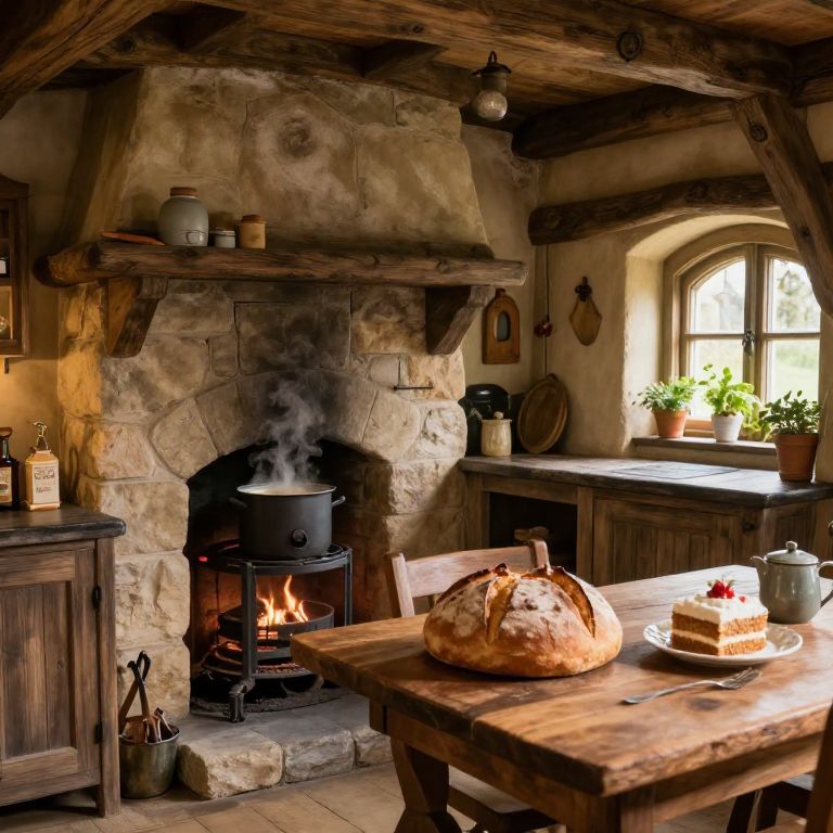 Photograph of a rustic, cozy kitchen with a stone fireplace emitting gentle flames and wisps of smoke. Exposed wooden beams and a wooden dining table dominate the scene. On the table, a loaf of crusty bread and a plate with a slice of cake topped with strawberries. Sunlight streams through an arched window, illuminating potted plants and wooden cabinets. Shelves above the fireplace hold various jars and small pots. The floor is tiled, and a metal kettle sits on a nearby counter. The overall ambiance is warm and inviting, with rich, earthy tones.