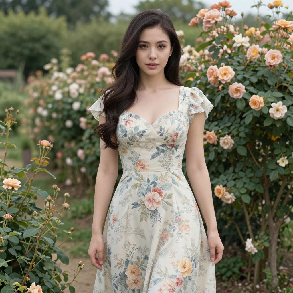 Photograph of a young Asian woman with long, wavy black hair, standing in a lush garden. She wears a white, floral-print dress with short sleeves, featuring pastel roses and green leaves. Her dress has a deep V-neck and a fitted waist. She has fair skin and a serene expression. The background shows a blurred garden with blooming peach and pink roses, green foliage, and a path. The natural light highlights the soft colors and textures of the dress and flowers. The overall mood is peaceful and elegant.