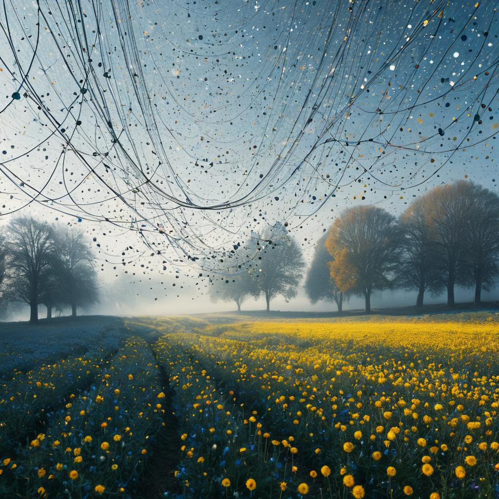 A vibrant and detailed landscape painting portraying a quantum realm with shimmering particles and interconnected strings. The scene features lush green trees and colorful fields under a bright, cloudy sky with dynamic light rays and dotted shimmering effects. Artistic style is inspired by Cézanne, Henri Matisse, and Henri Rousseau, blending impressionism with abstract elements in an 8k panoramic view.