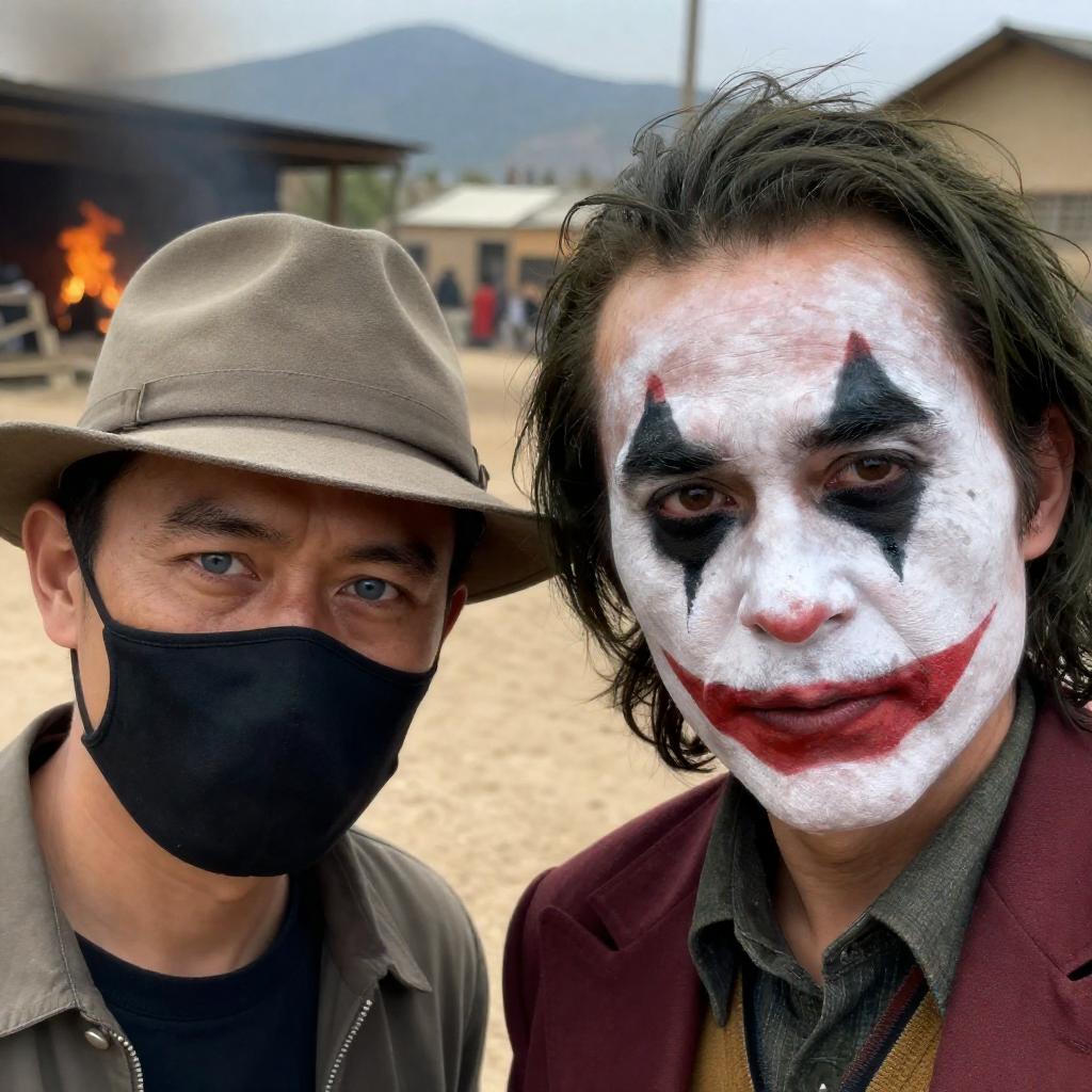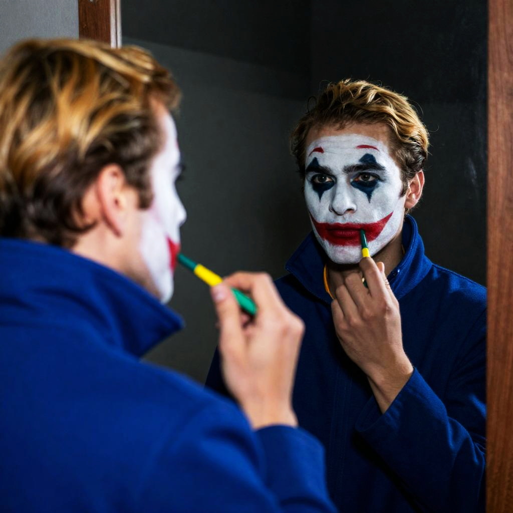 Asian man with a shaved head wearing a blue plaid shirt has his face painted in a white Joker style with black and red details. Another person in an orange shirt is applying the face paint with a focused expression. In the background, a woman with long dark hair looks surprised by the transformation, set against a wooden backdrop.
