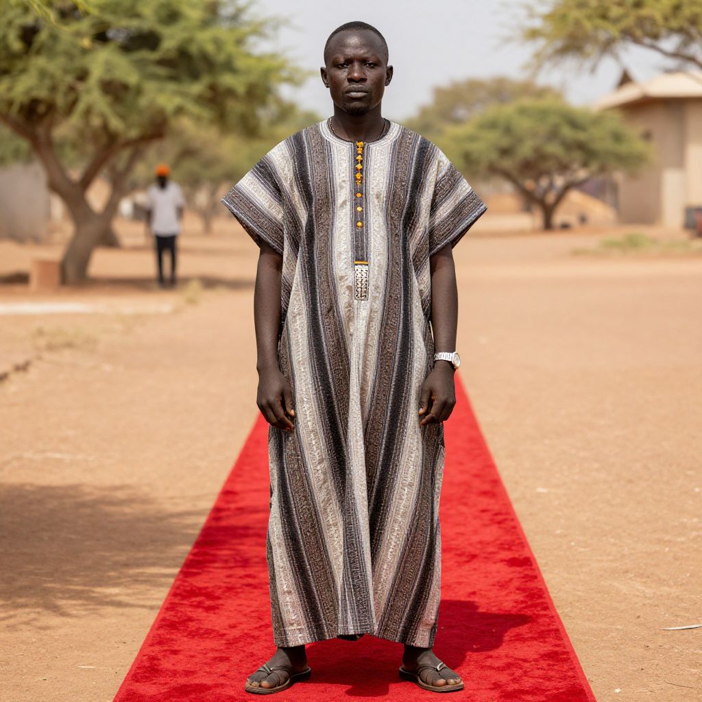Photograph of a tall, dark-skinned African man standing on a bright red carpet in a sunlit, sandy outdoor setting. He wears a long, black-and-white striped, loose-fitting traditional garment with short sleeves and a buttoned front. He has a serious expression, a white wristwatch on his left wrist, and dark sandals on his feet. In the blurred background, there are two people, one wearing a white shirt and dark pants, and trees with green foliage. The red carpet runs straight from the foreground to the background, creating a focal point. The overall atmosphere is sunny and rural.