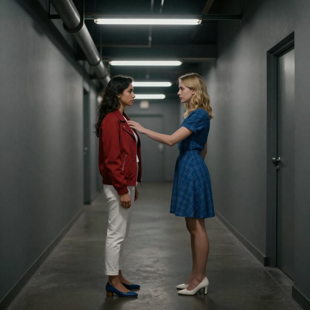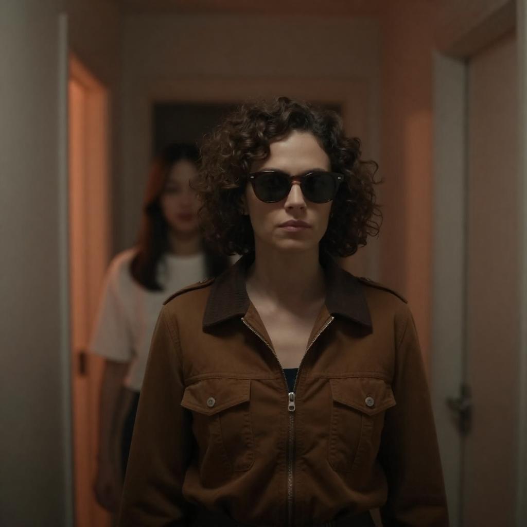Young woman with long curly hair walking confidently down a narrow, dimly lit hallway lined with metal lockers on both sides. She is wearing a brown button-up shirt, black pants, and black shoes while carrying a black bag on one shoulder. A yellow poster is visible on the wall at the end of the hallway.