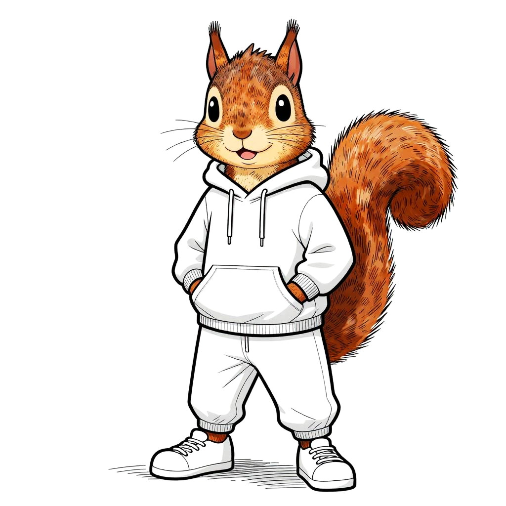 Digital line art portrait of male anthropomorphic squirrel, wearing hoodie and joggers. Created in expressive, stylized line art with vibrant details.