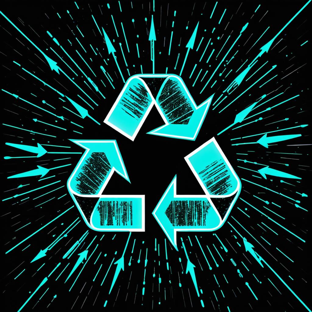 A turquoise recycle logo with a black background. The arrows are electrified, glowing with vibrant energy