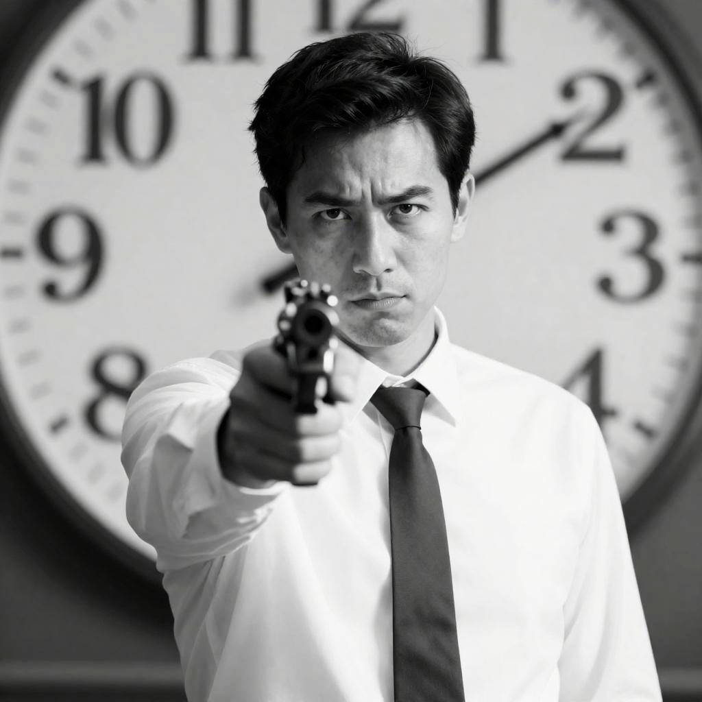 Digital illustration of a man with dark hair, white shirt, black tie, pointing a silver handgun directly at the viewer. Intense facial expression. Light blue background. Hand and gun prominently in foreground.