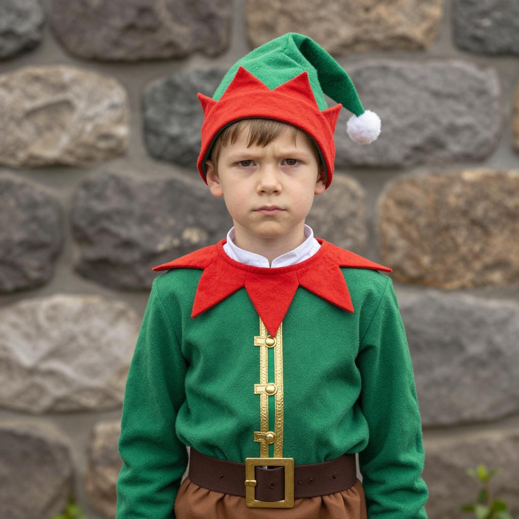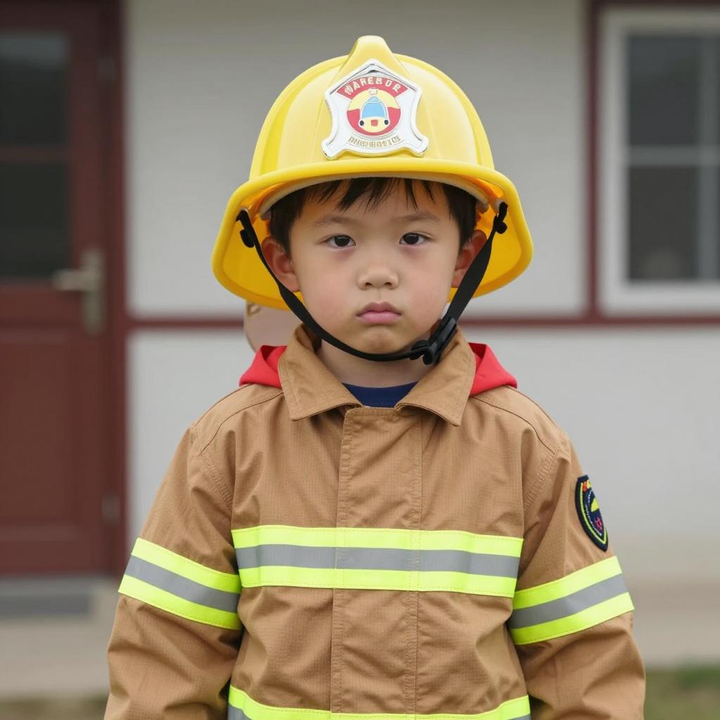 Toadette costume, photograph of young boy, wearing bright yellow shirt with white polka dot waistband, and orange hat with red spots, standing outdoors, blue door in background, daytime, clear sky, slightly serious expression, short brown hair, casual clothing, summer, colorful, centered composition, natural light, soft shadows, simple background, realistic style, child, young age, cute, playful outfit