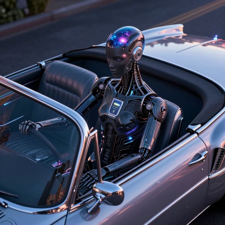 A futuristic digital art portrait of an android with intricate circuitry patterns adorning their sleek obsidian skin, viewed from an unconventional high-angle perspective above their shimmering iridescent hair resembling a celestial galaxy. The android sits within the driver's seat of a vintage 1950s convertible car, its chrome exterior reflecting the starlit sky and surrounding vivid cityscape. Soft, ethereal light emanates from pulsating energy sources throughout the vehicle, casting dramatic shadows that highlight the harmonious blend of technology and nature in this captivating scene evoking a sense of nostalgia for the future.