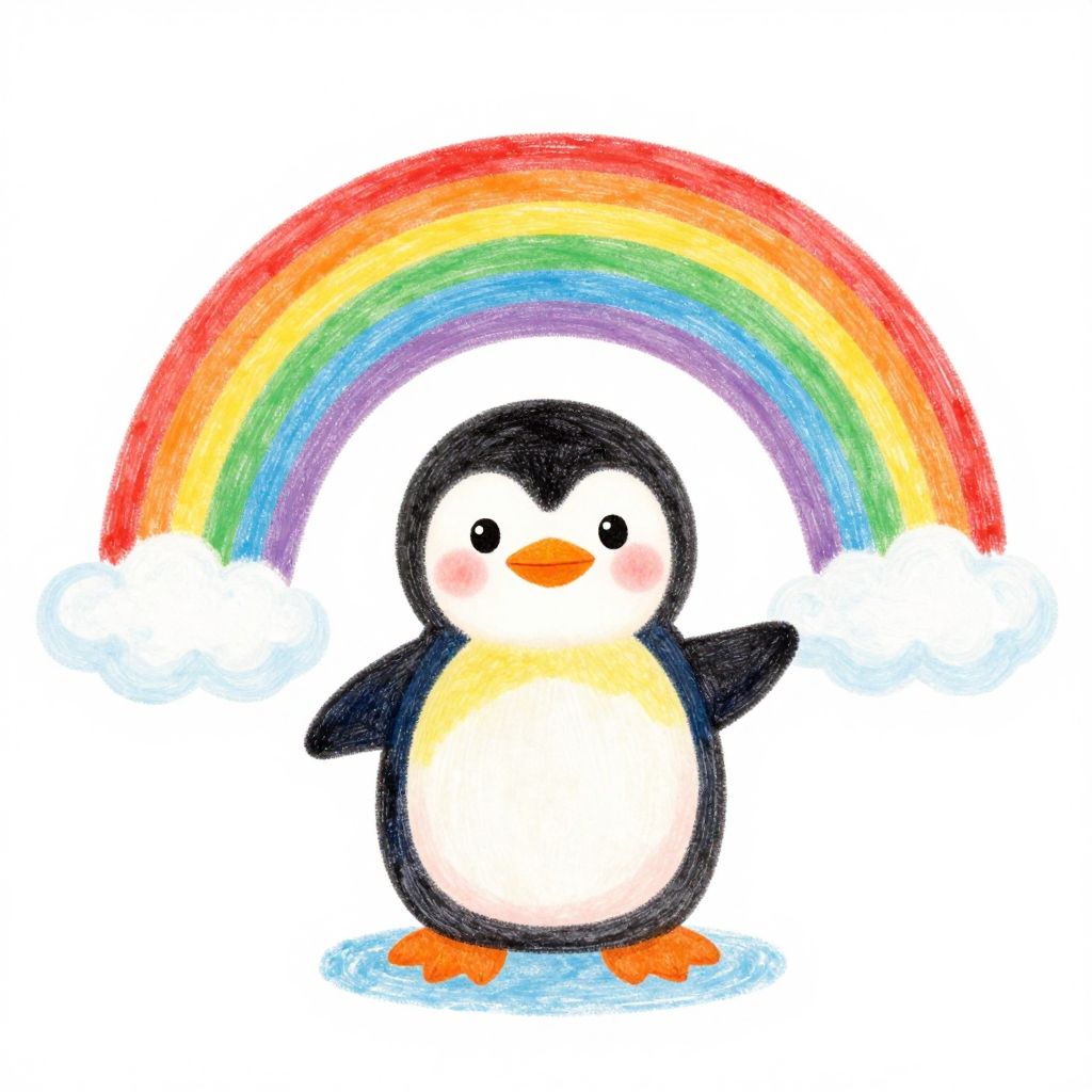 A colorful child's drawing of a cute penguin with bright, multicolored patches on its body standing in front of a large, vibrant rainbow with fluffy clouds. The penguin has an orange beak and feet with a playful expression, set against a white background with soft pastel rainbow hues.
