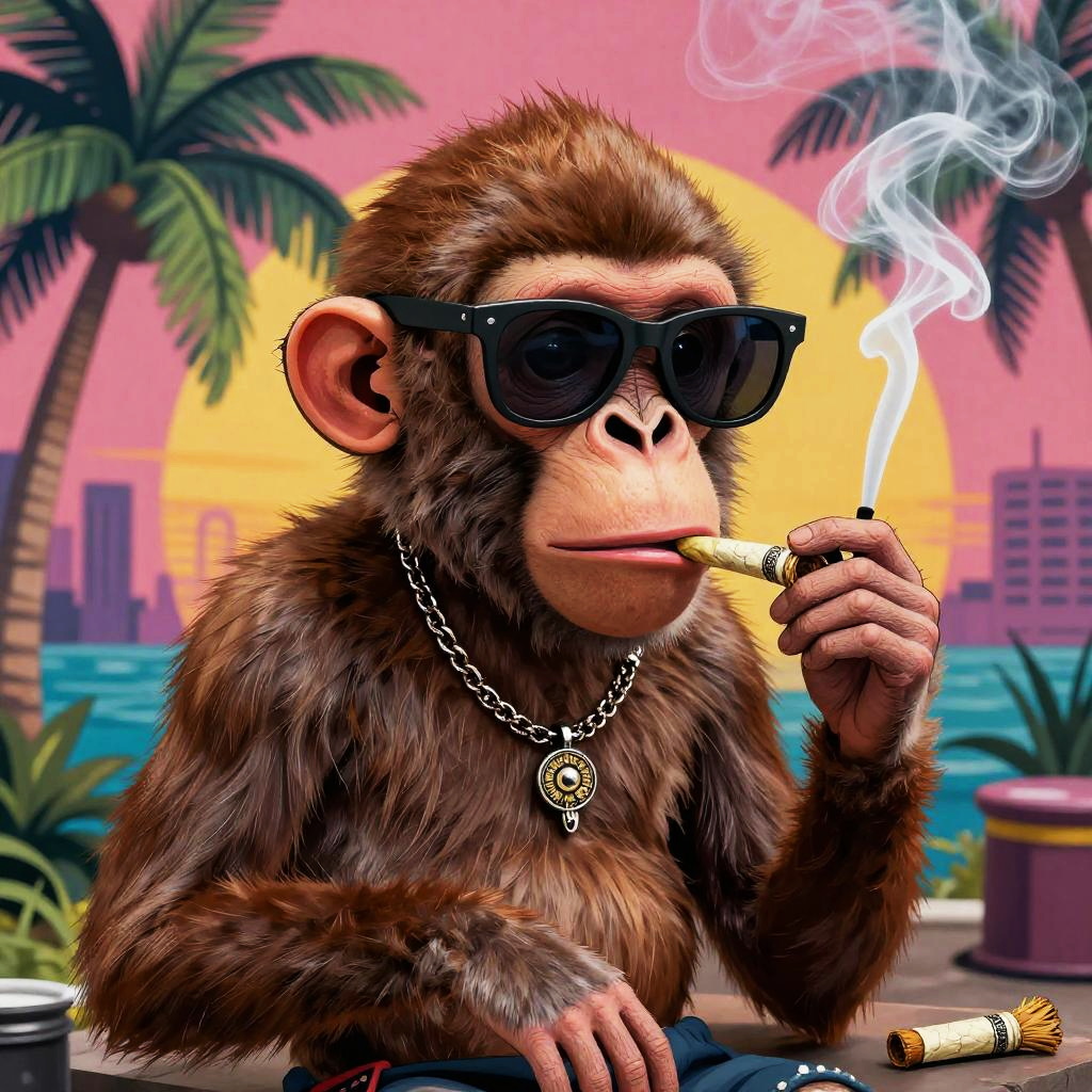 Bored ape weed concept, a cool monkey wearing sunglasses and smoking a joint in a tropical setting, vivid colors, high detail, urban street art style