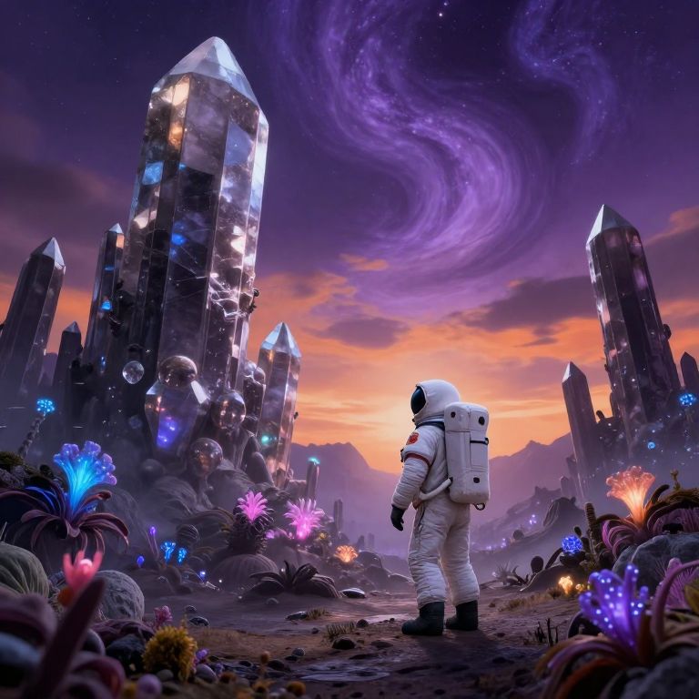 A digital artwork depicts a lone astronaut in a white spacesuit with a backpack standing on a rocky, alien landscape at sunset. The sky is vibrant with swirling purple and orange clouds. Tall, crystalline structures illuminated with blue and pink bioluminescent lights rise in the background. Colorful glowing plants and rocks dot the foreground. The scene combines elements of science fiction and fantasy, creating a surreal, otherworldly atmosphere. The astronaut's back is to the viewer, looking towards the illuminated structures.
