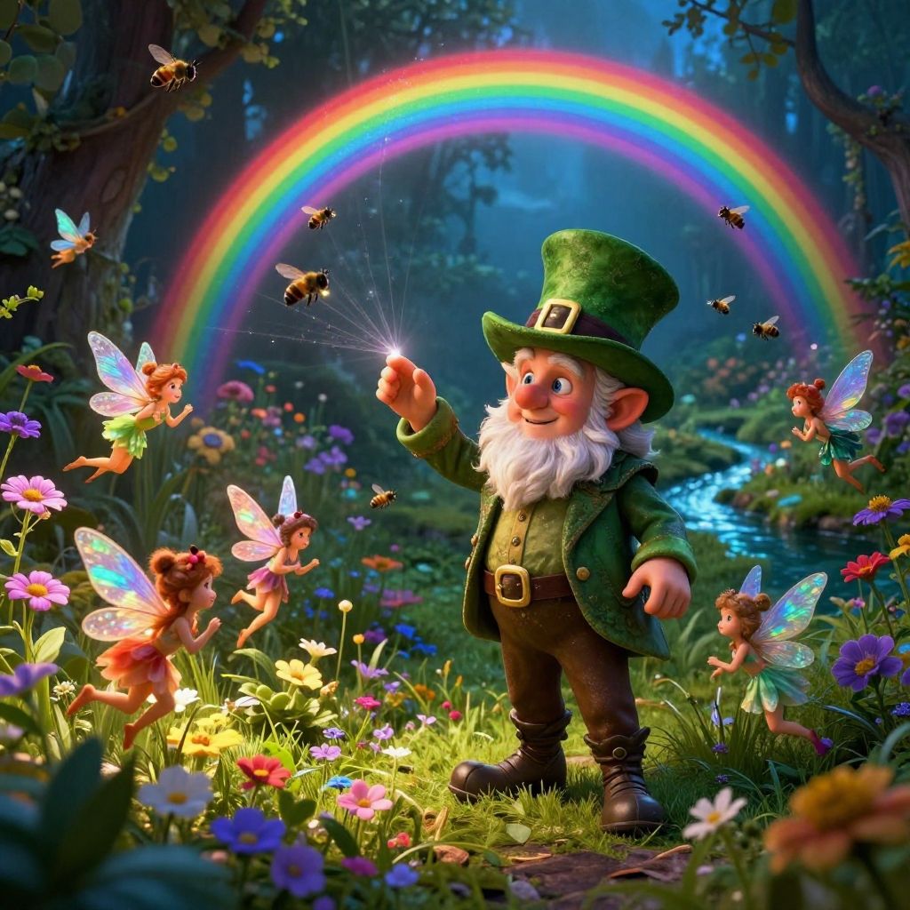 (masterpiece, best quality, ultra-detailed, best shadow), (detailed background, dark fantasy), (beautiful detailed face), high contrast, (best illumination, an extremely delicate and beautiful), ((cinematic light)), colorful, hyper detail, dramatic light, intricate details, leprechaun and the fairies, 1 leprechaun, 1 fairies In the whimsical scene, the mischievous leprechaun works his magic, weaving vibrant rainbows into existence amidst the miniature garden. The tiny flowers, kissed by the sun's rays, burst into bloom, their colors rivaling the brilliance of the rainbow arching overhead. Meanwhile, the curious fairies dart and dance among the blossoms, their laughter echoing through the meadow. The air is alive with the melody of buzzing bees and the gentle rustle of leaves, while the sweet fragrance of wildflowers fills every corner of the enchanted space. As the fairies flit about, the sunlight catches their iridescent wings, casting shimmering reflections upon the surrounding flora. And in the tranquil distance, the babbling brook meanders through the landscape, its clear waters mirroring the azure sky above, inviting all who behold it into a world of wonder and magic.