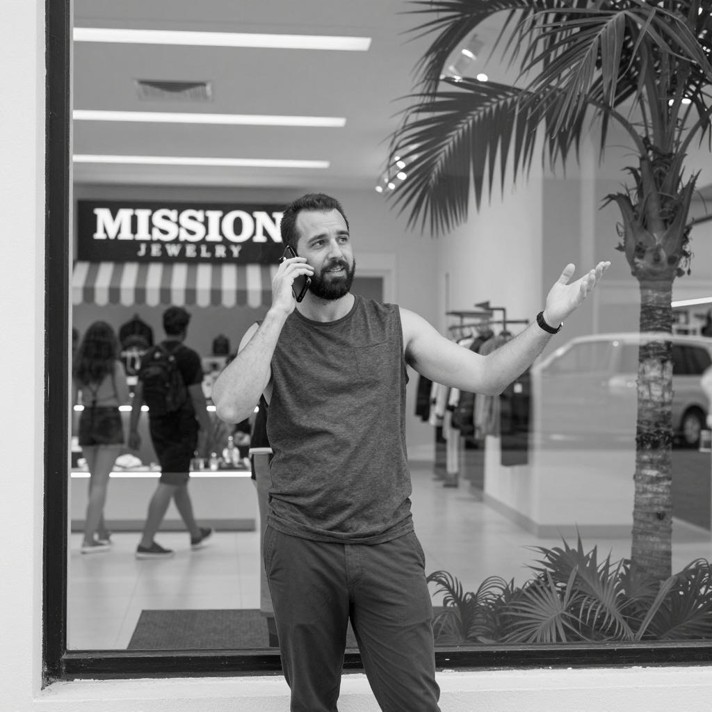 Man in dark suit with red shirt stands in telephone booth, talking on phone. Public indoor space, neon lights, retail shop in background. Posters on glass walls. Other people in background. Stone wall on right. Casual, urban setting.