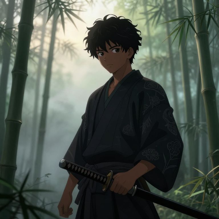 Dark skin anime boy with short curly hair, dressed in traditional samurai attire, holding a katana, set against a misty bamboo forest at dawn, soft light filtering through the trees, intricate character design, serene and mysterious mood with delicate nature details.