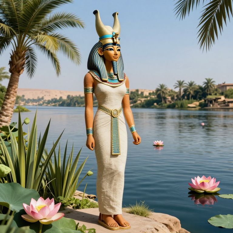 Egyptian goddess figure standing by the Nile riverbank, wearing traditional linen dress and elaborate headdress, lotus flowers floating on the water, lush palms and papyrus plants around, vibrant colors, mystical and divine vibe, highly detailed
