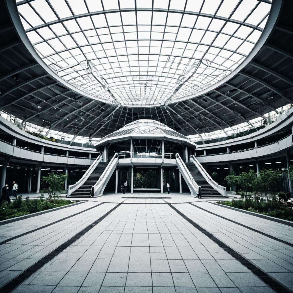 Spacious, high-tech ground floor pavilion at an urban zoo featuring a complex and aesthetic design. The pavilion has a large circular glass dome roof with a modern steel framework, measuring approximately 1000 square meters in area and 12 meters in height. The structure includes a central cylindrical glass enclosure surrounded by wide tiled flooring and greenery, with visitors walking around inside, highlighting its futuristic architecture.