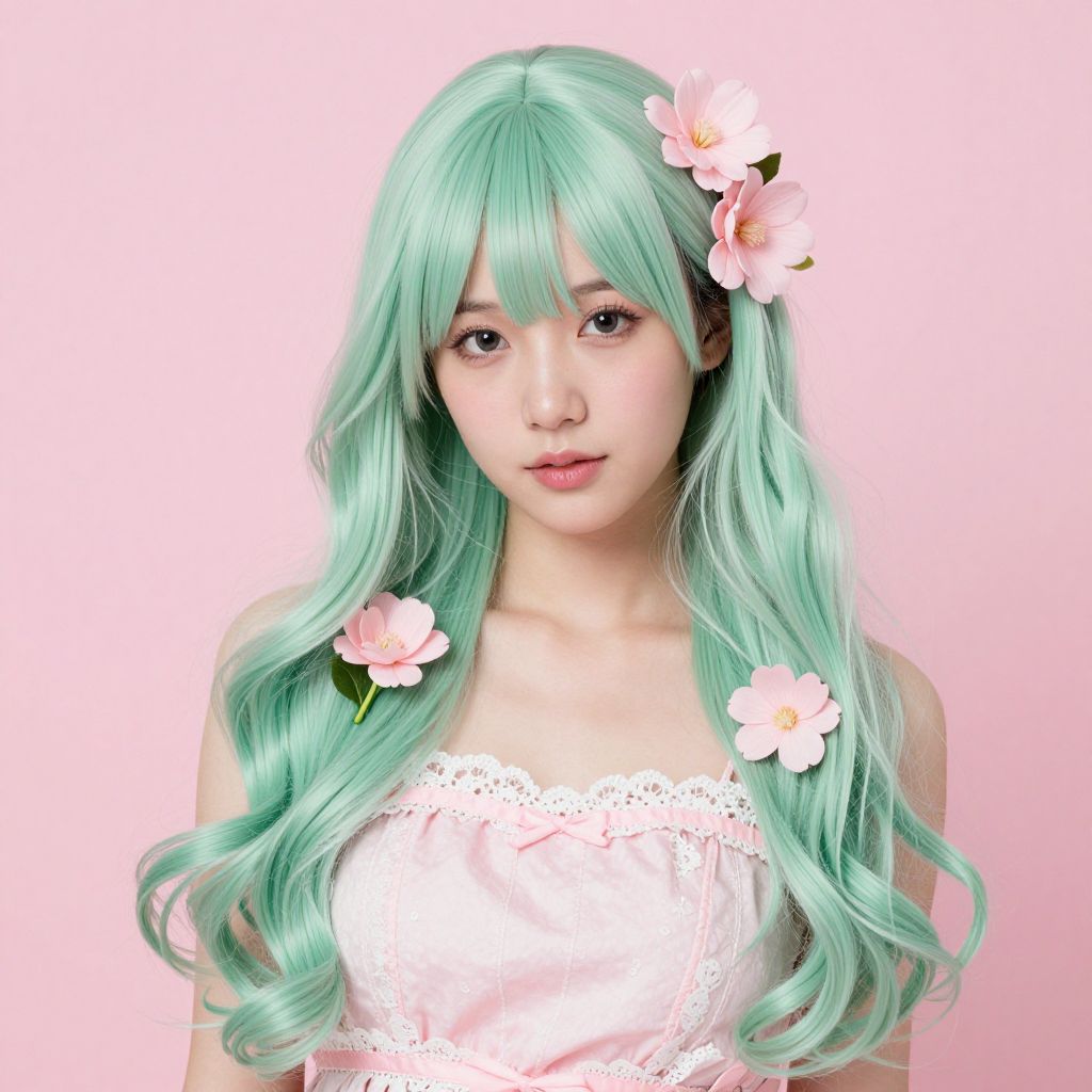A mint green-haired woman adorned with pink flowers and a matching dress, set against a soft pink background.