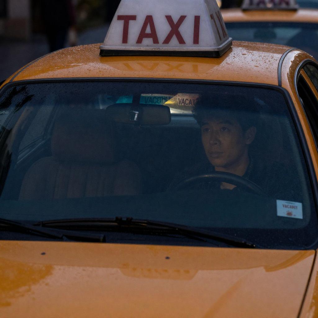 Photograph of a yellow taxi at night. Driver with short, curly black hair, focused expression, looking slightly to the left. Taxi roof light reads "TAXI" with "VACANT" above. Raindrops on windshield. Front windshield wiper partially visible. Dark background.
